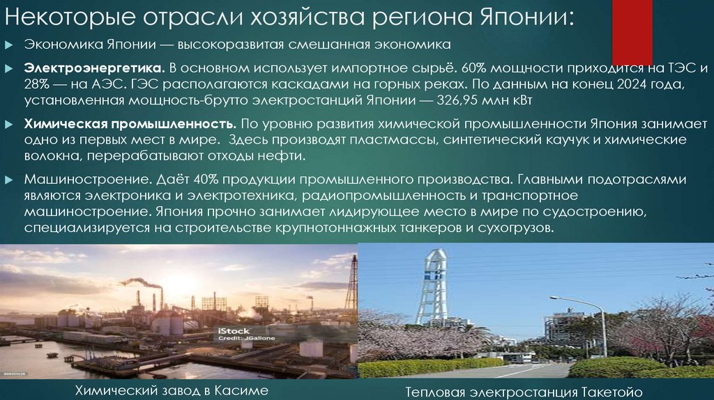 Некоторые отрасли хозяйства региона Японии:Экономика Японии — высокоразвитая смешанная экономика