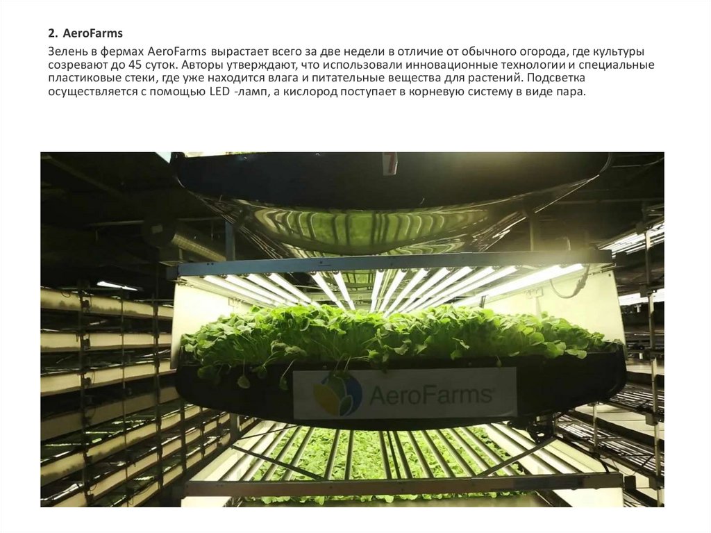 2. AeroFarmsЗелень в фермах AeroFarms вырастает всего за две недели в отличие от обычного огорода, где культуры