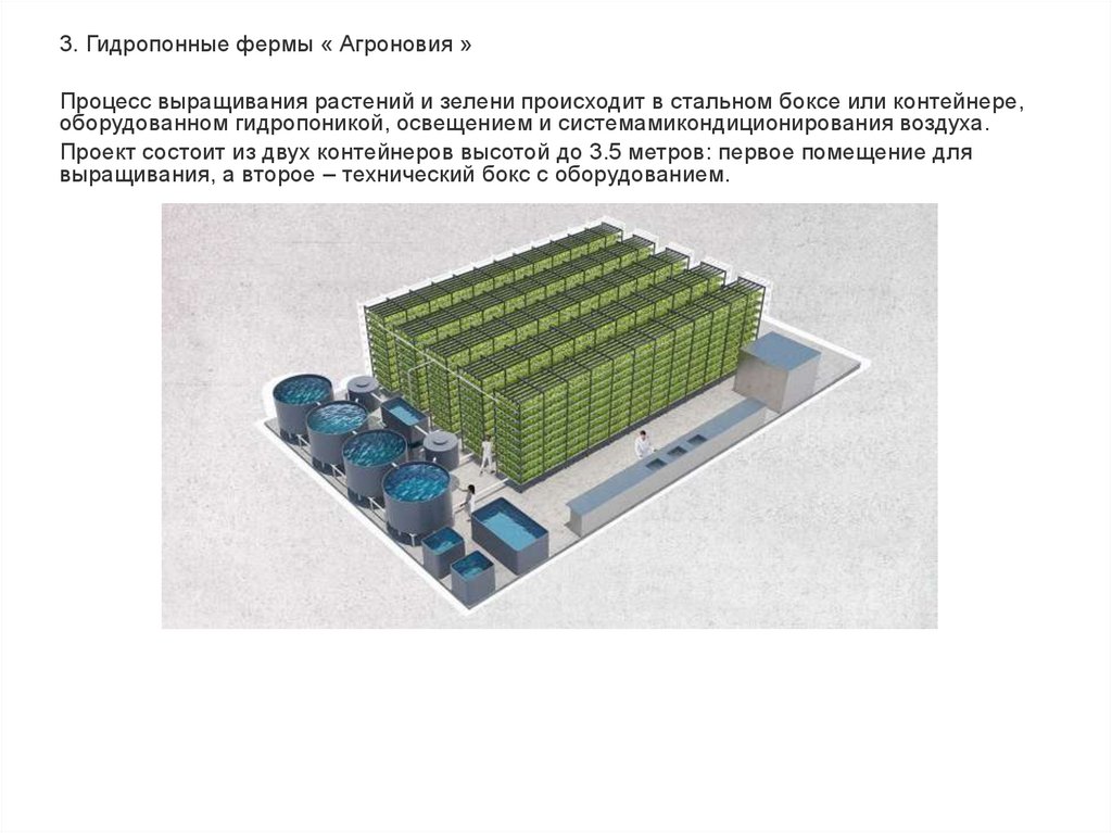 3. Гидропонные фермы « Агроновия »Процесс выращивания растений и зелени происходит в стальном боксе или контейнере,