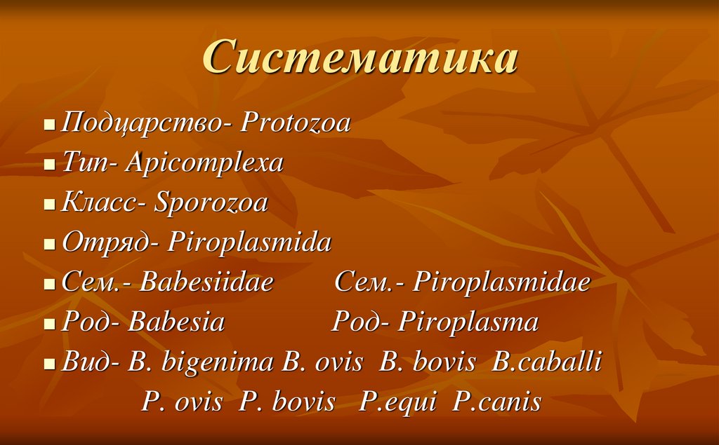 bigemina, В. ovis, В. caballi, В. divergens, В.