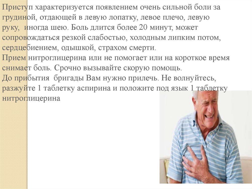 Приступ характеризуется появлением очень сильной боли загрудиной, отдающей в левую лопатку, левое плечо, левую