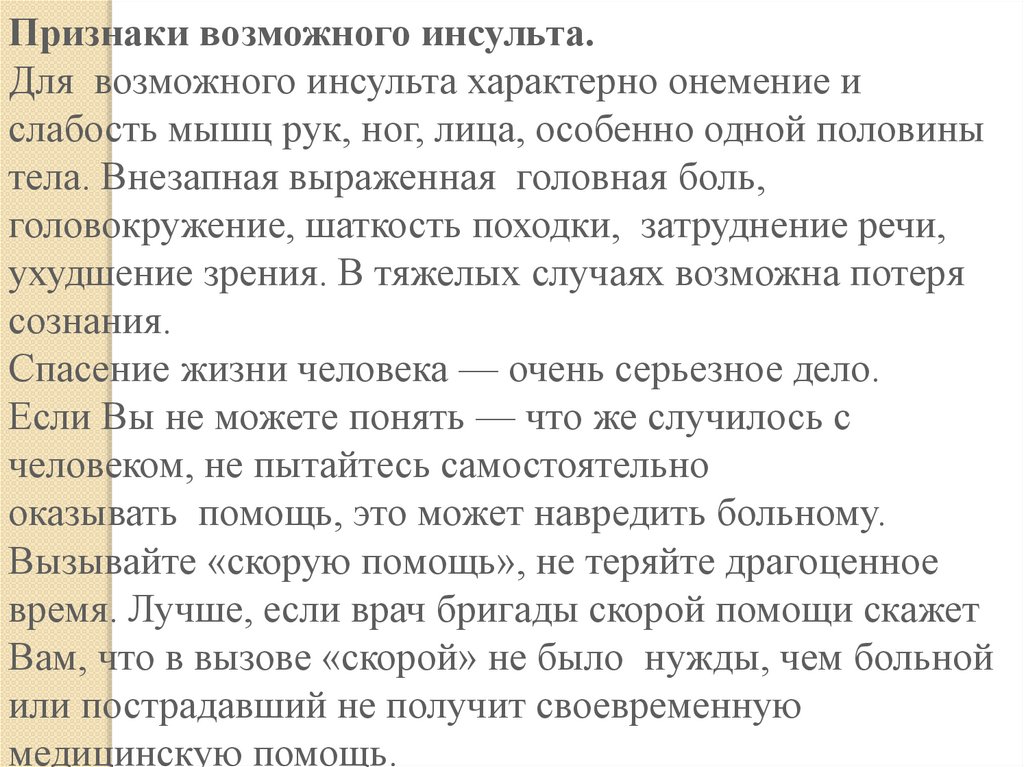 Признаки возможного инсульта.Для возможного инсульта характерно онемение и