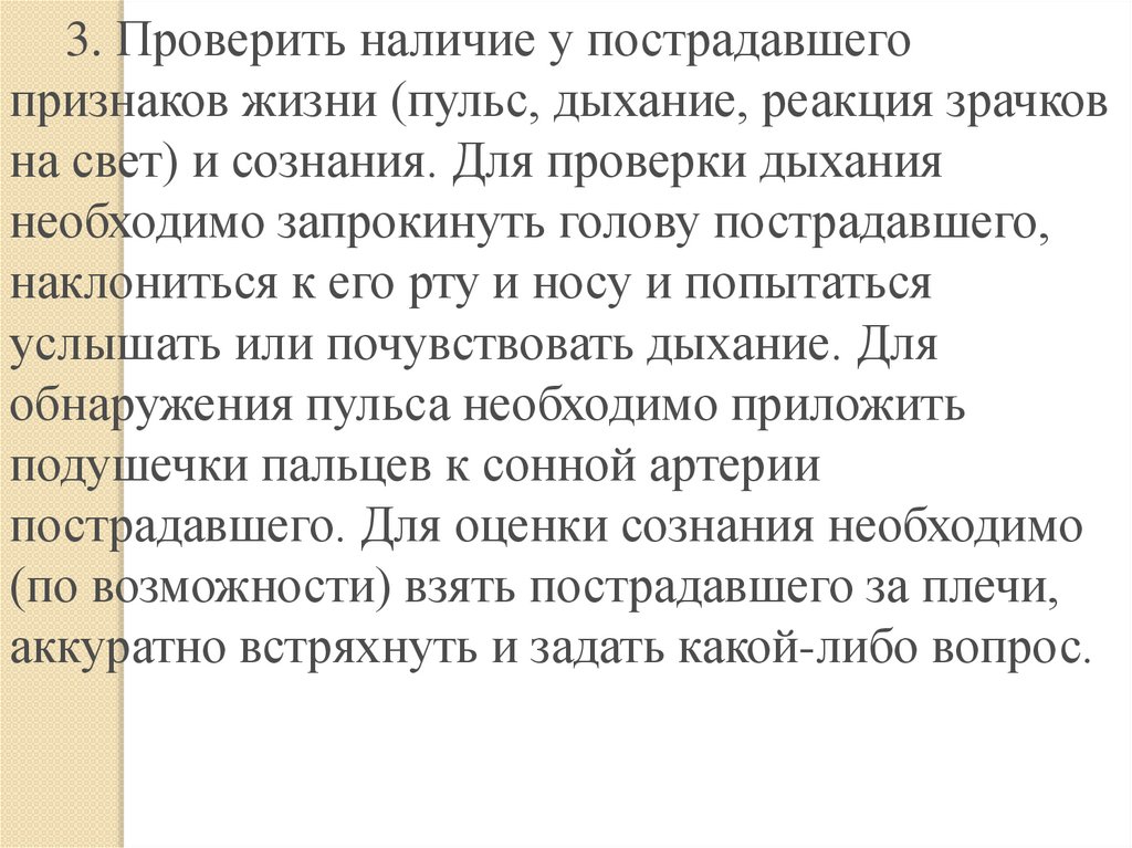 3. Проверить наличие у пострадавшегопризнаков жизни (пульс, дыхание, реакция зрачков