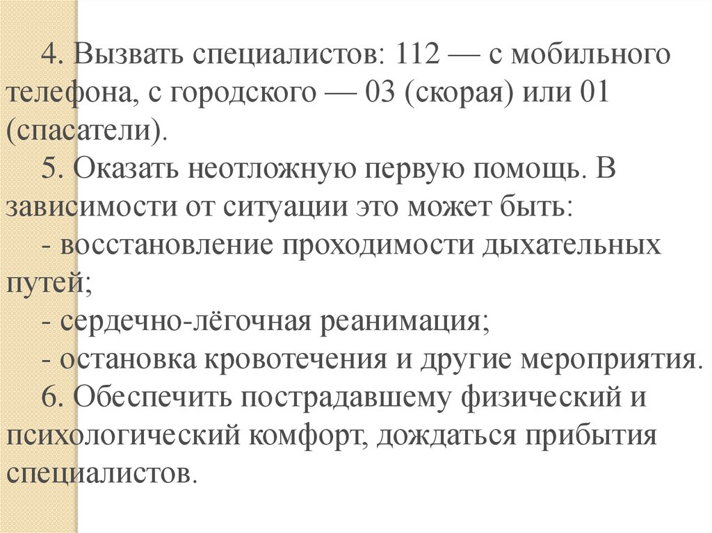 4. Вызвать специалистов: 112 — с мобильноготелефона, с городского — 03 (скорая) или 01