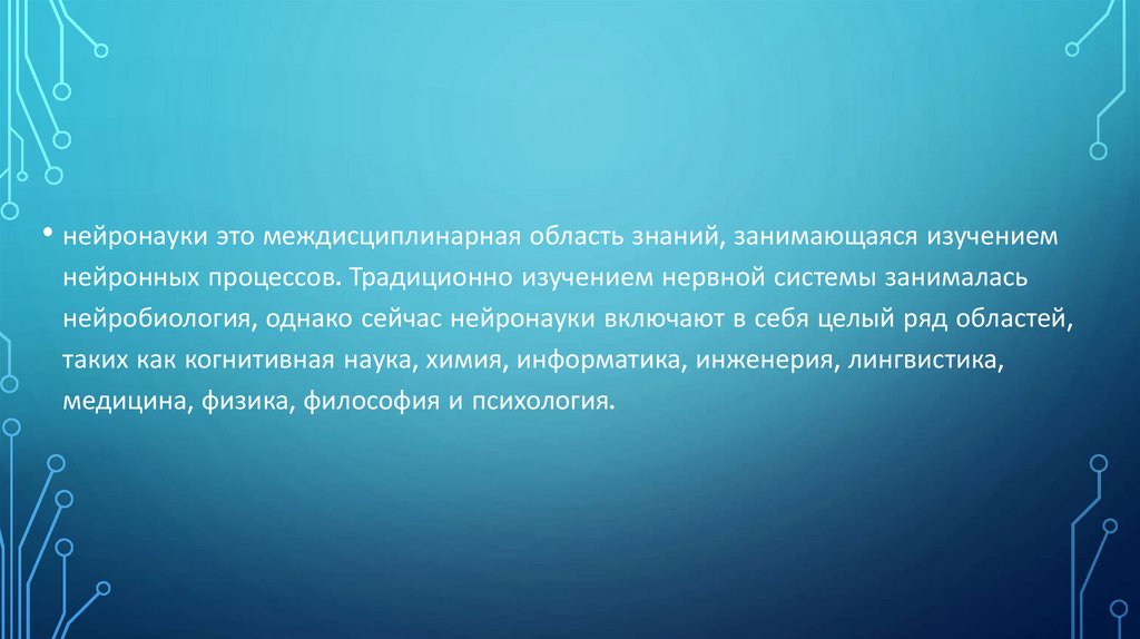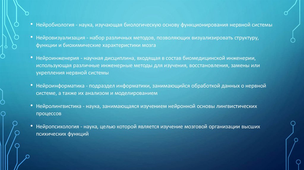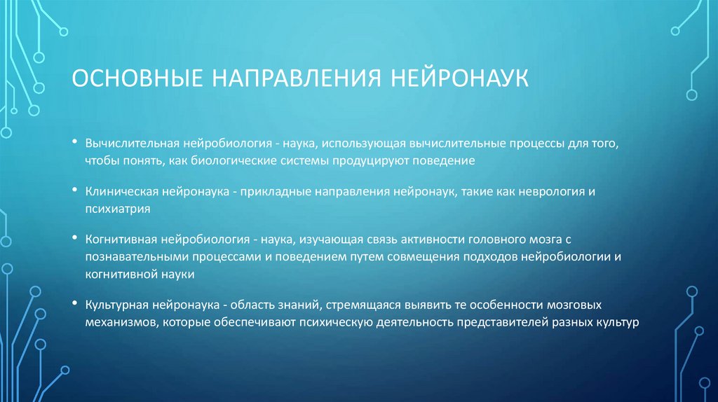 нейробиология, однако сейчас нейронауки включают в себя целый ряд областей,