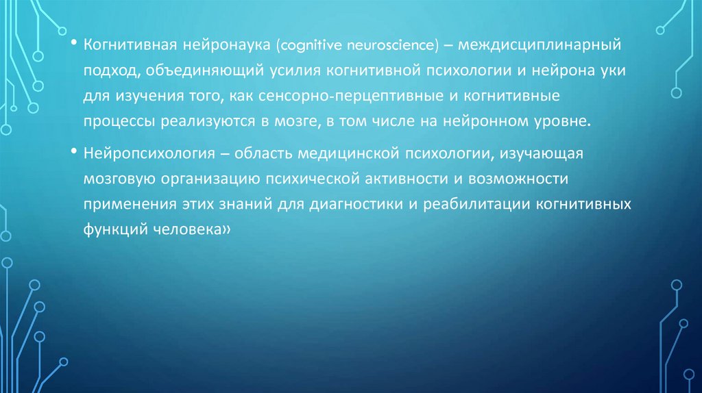 • Когнитивная нейробиология - наука, изучающая связь активности головного мозга с