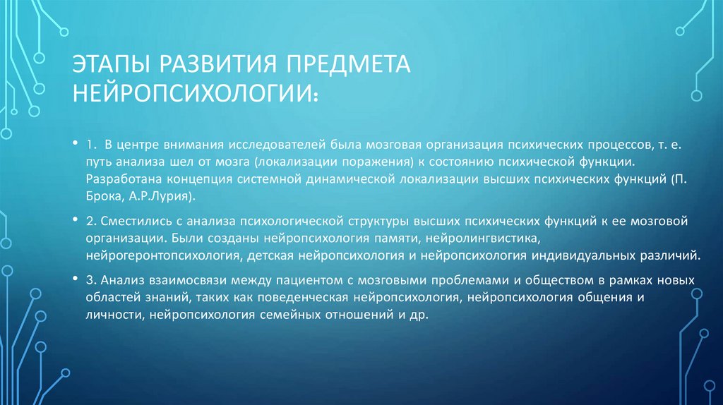 ЭТАПЫ РАЗВИТИЯ ПРЕДМЕТАНЕЙРОПСИХОЛОГИИ: