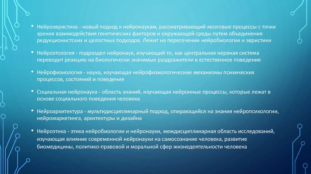 • Нейроэвристика - новый подход к нейронаукам, рассматривающий мозговые процессы с точкизрения взаимодействия генетических факторов и окружающей среды путем объединения