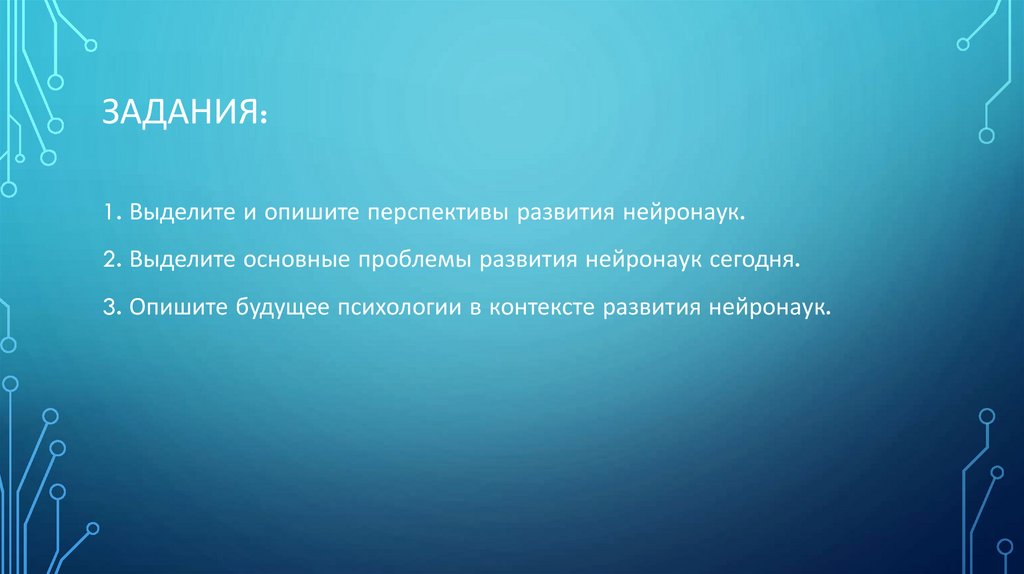 ЗАДАНИЯ:1. Выделите и опишите перспективы развития нейронаук.