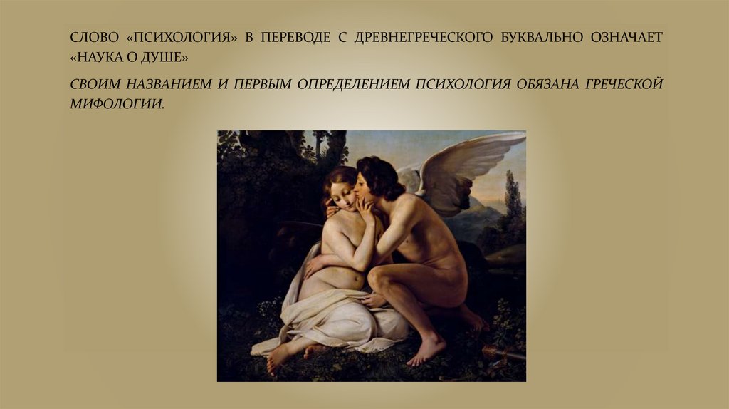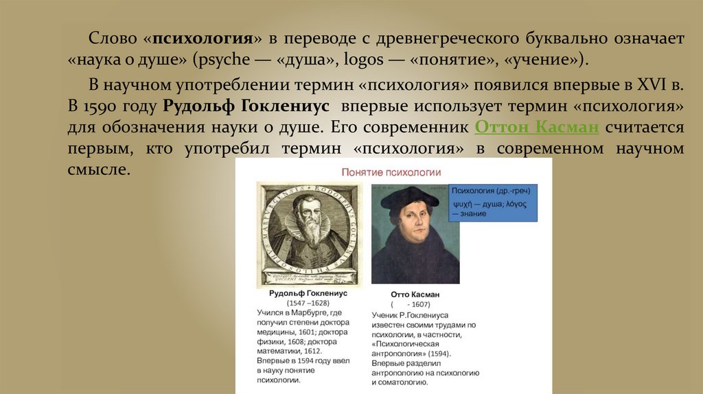 Слово «психология» в переводе с древнегреческого буквально означает«наука о душе» (psyche — «душа», logos — «понятие», «учение»).