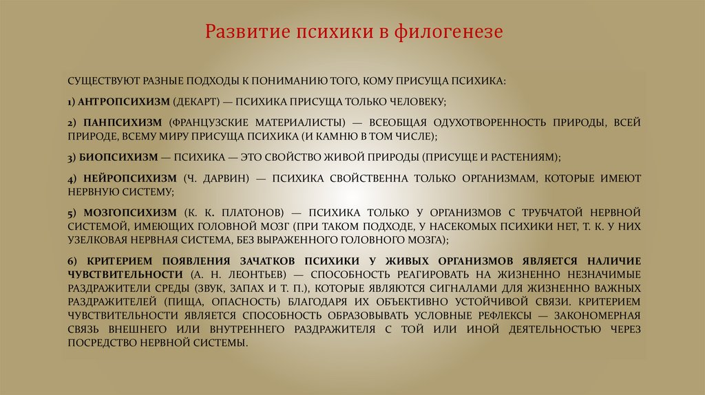 Развитие психики в филогенезеСУЩЕСТВУЮТ РАЗНЫЕ ПОДХОДЫ К ПОНИМАНИЮ ТОГО, КОМУ ПРИСУЩА ПСИХИКА: