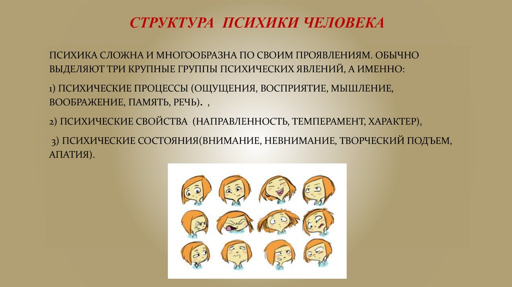 СТРУКТУРА ПСИХИКИ ЧЕЛОВЕКАПСИХИКА СЛОЖНА И МНОГООБРАЗНА ПО СВОИМ ПРОЯВЛЕНИЯМ. ОБЫЧНО