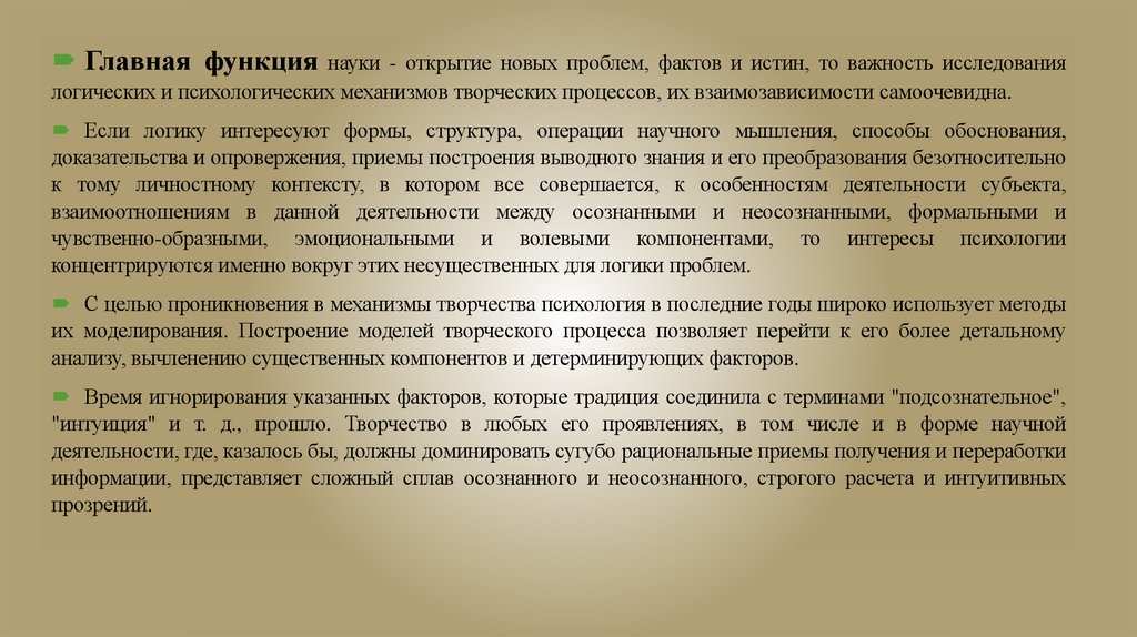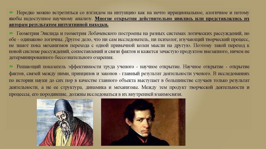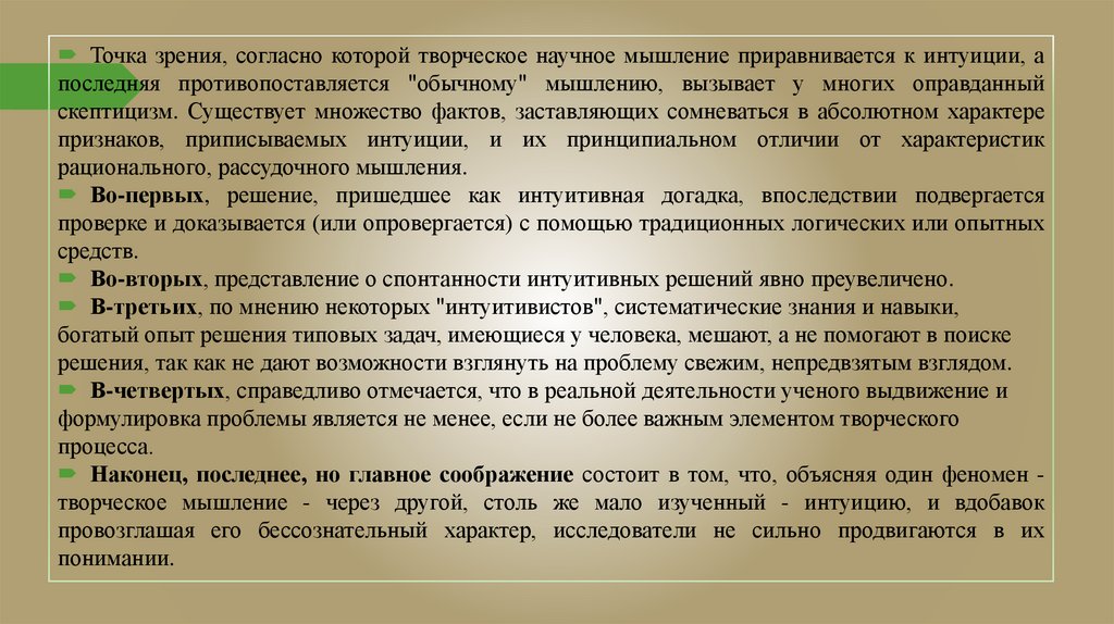 Точка зрения, согласно которой творческое научное мышление приравнивается к интуиции, апоследняя противопоставляется "обычному" мышлению, вызывает у многих оправданный
