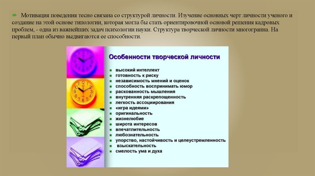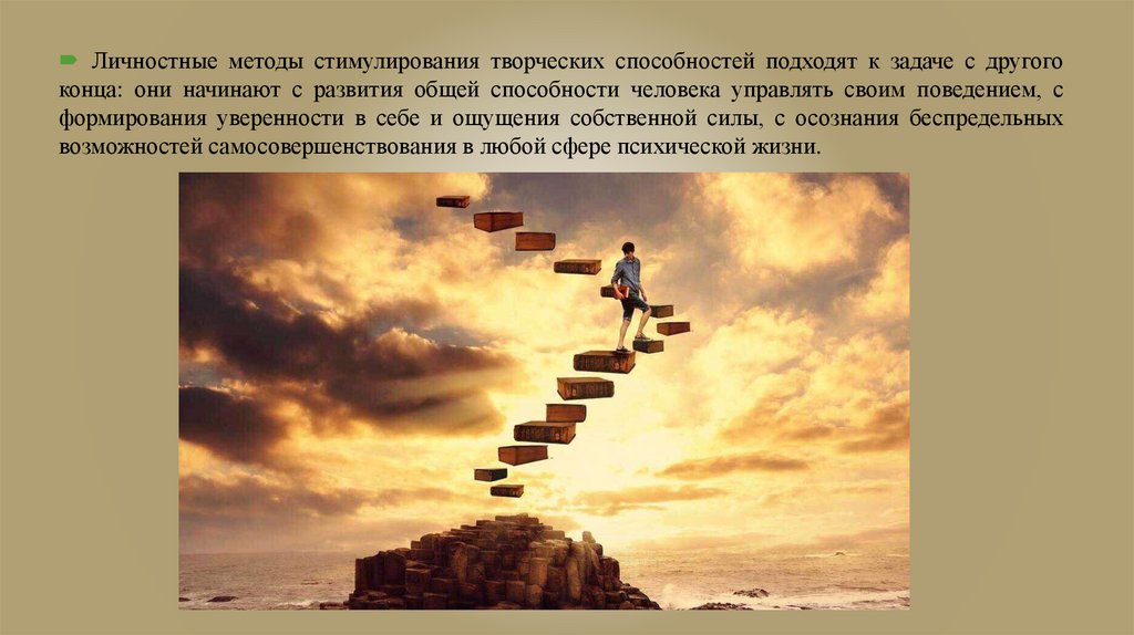 Личностные методы стимулирования творческих способностей подходят к задаче с другогоконца: они начинают с развития общей способности человека управлять своим поведением, с