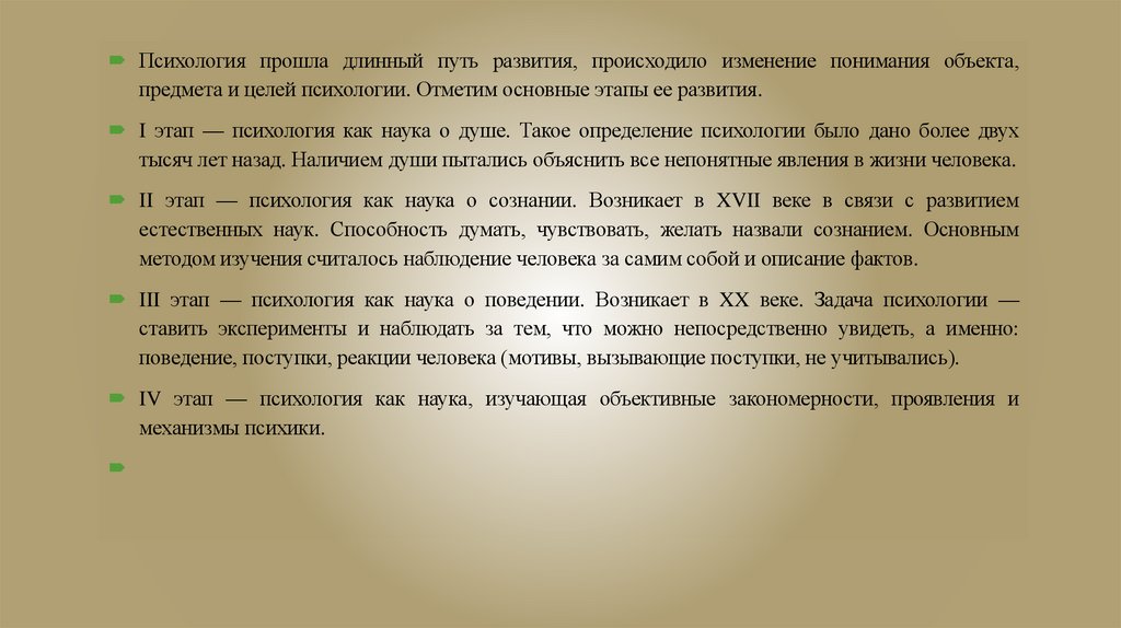 Психология прошла длинный путь развития, происходило изменение понимания объекта,предмета и целей психологии. Отметим основные этапы ее развития.