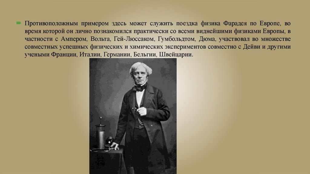 Противоположным примером здесь может служить поездка физика Фарадея по Европе, вовремя которой он лично познакомился практически со всеми виднейшими физиками Европы, в