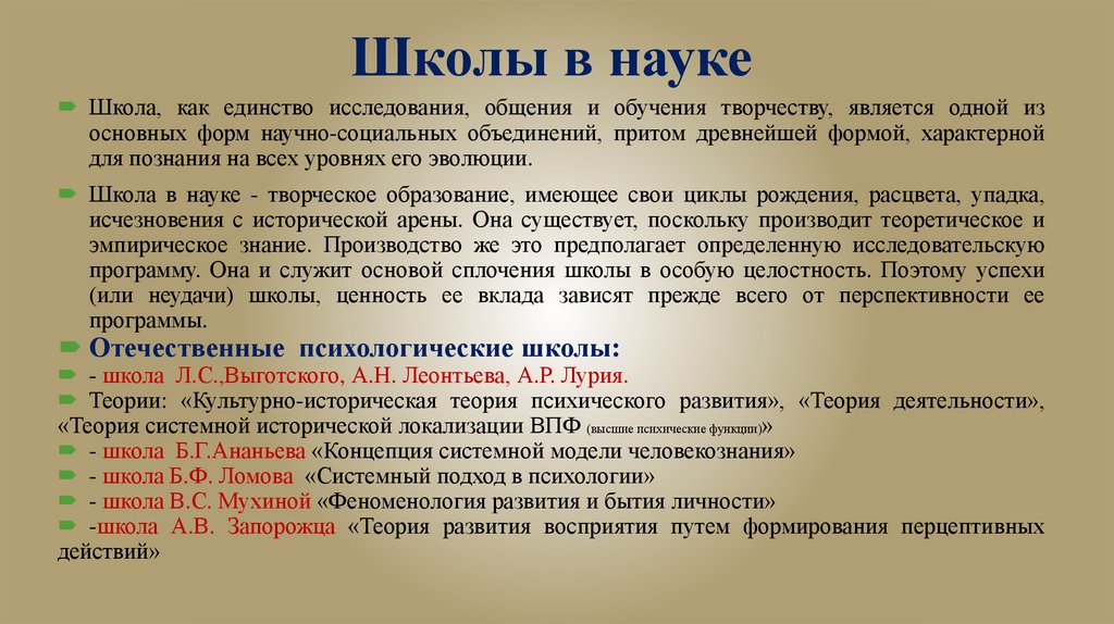 - школа Л.С.,Выготского, А.Н. Леонтьева, А.Р. Лурия.