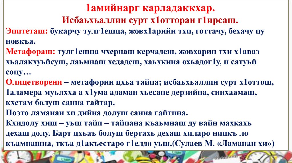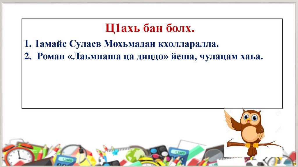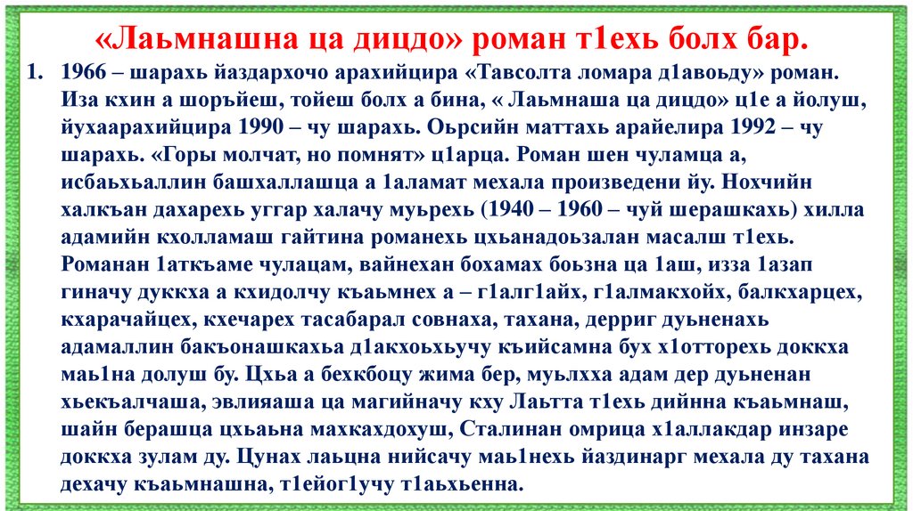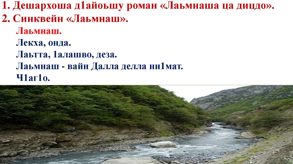 1. Дешархоша д1айоьшу роман «Лаьмнаша ца дицдо».2. Синквейн «Лаьмнаш».