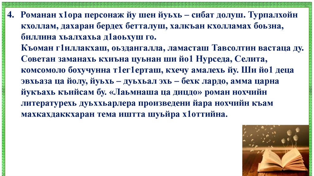 4. Романан х1ора персонаж йу шен йуьхь – сибат долуш. Турпалхойнкхоллам, дахаран бердех бетталуш, халкъан кхолламах боьзна,
