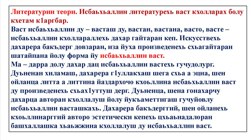 Литературин теори. Исбаьхьаллин литературехь васт кхолларах болукхетам к1аргбар.