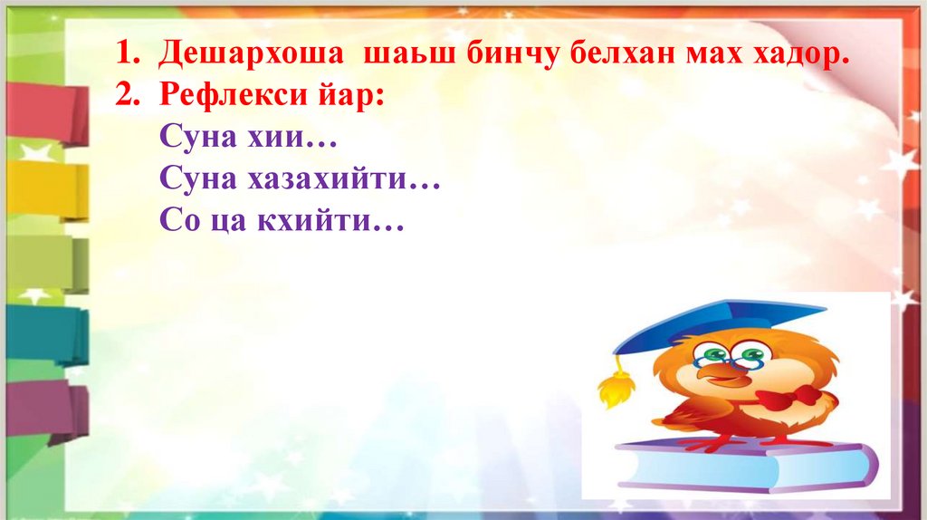 1. Дешархоша шаьш бинчу белхан мах хадор.2. Рефлекси йар:
