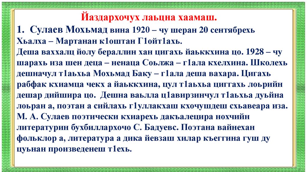 Хьехарсахьтан ц1е:Сулаев Мохьмад «Лаьмнаша ца дицдо».