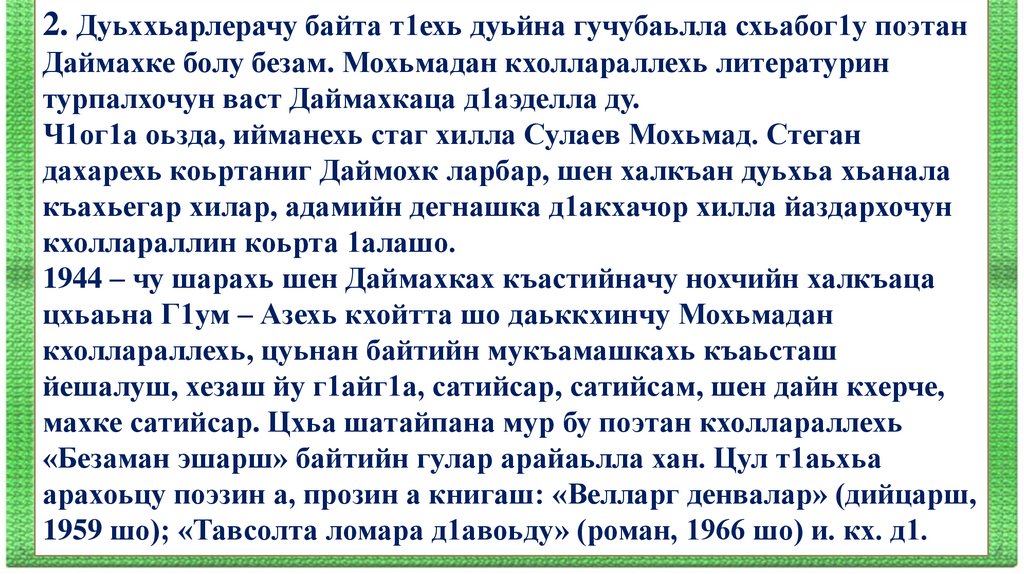 2. Дуьххьарлерачу байта т1ехь дуьйна гучубаьлла схьабог1у поэтанДаймахке болу безам. Мохьмадан кхоллараллехь литературин
