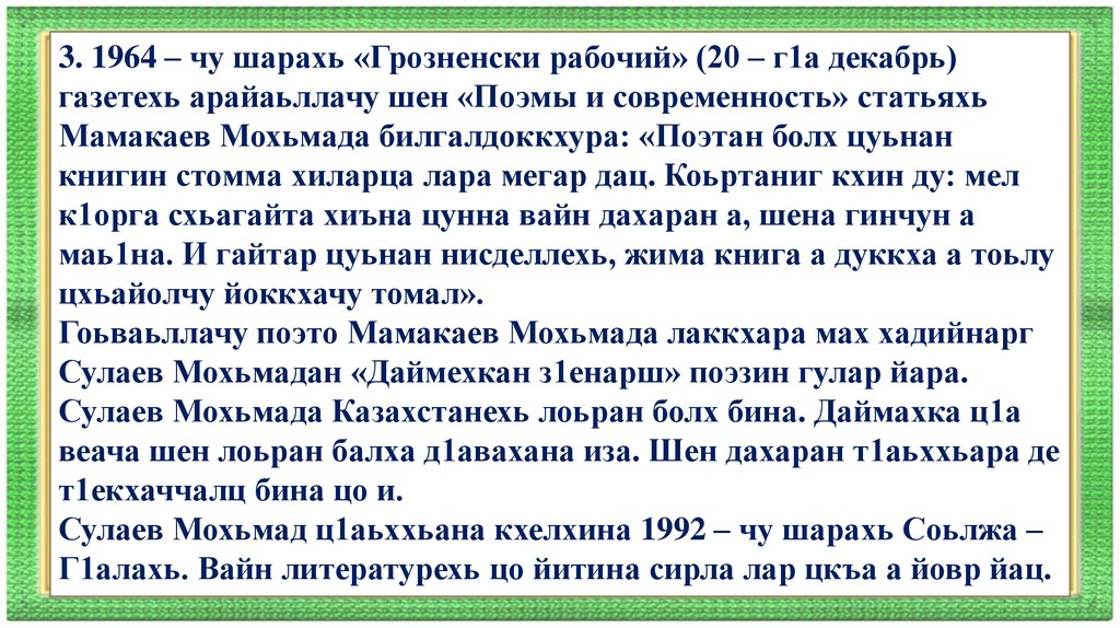3. 1964 – чу шарахь «Грозненски рабочий» (20 – г1а декабрь)газетехь арайаьллачу шен «Поэмы и современность» статьяхь