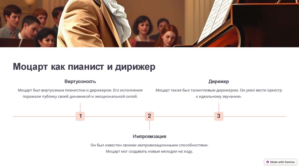 Моцарт был виртуозным пианистом и дирижером. Его исполнения