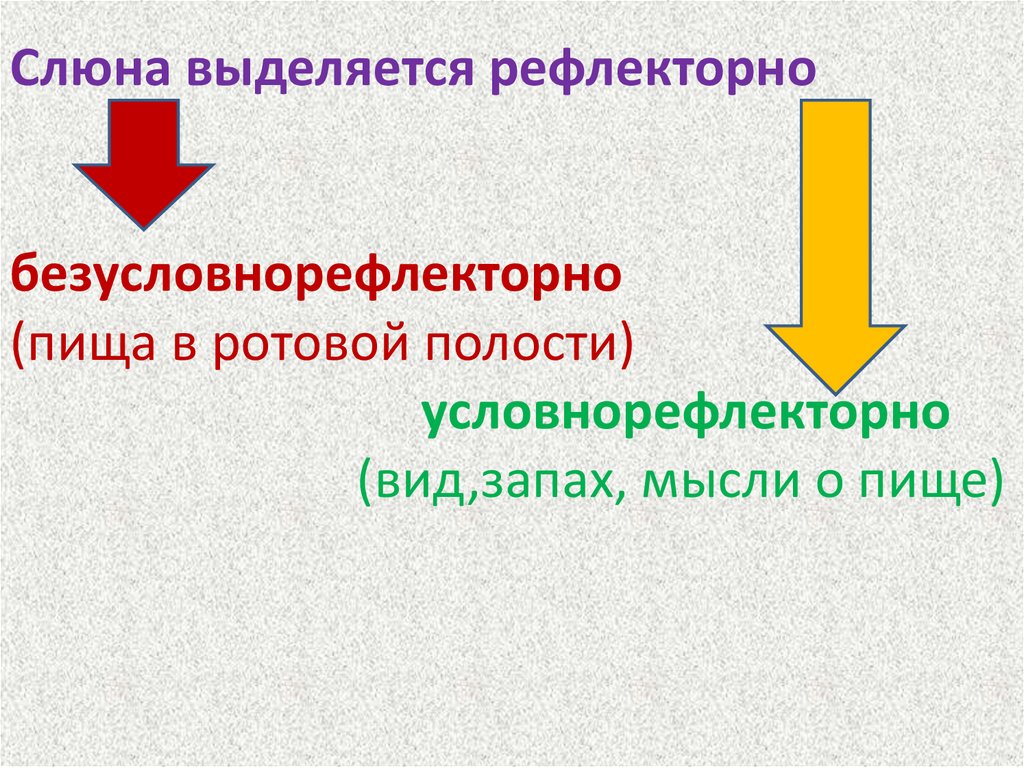 Слюна выделяется рефлекторнобезусловнорефлекторно