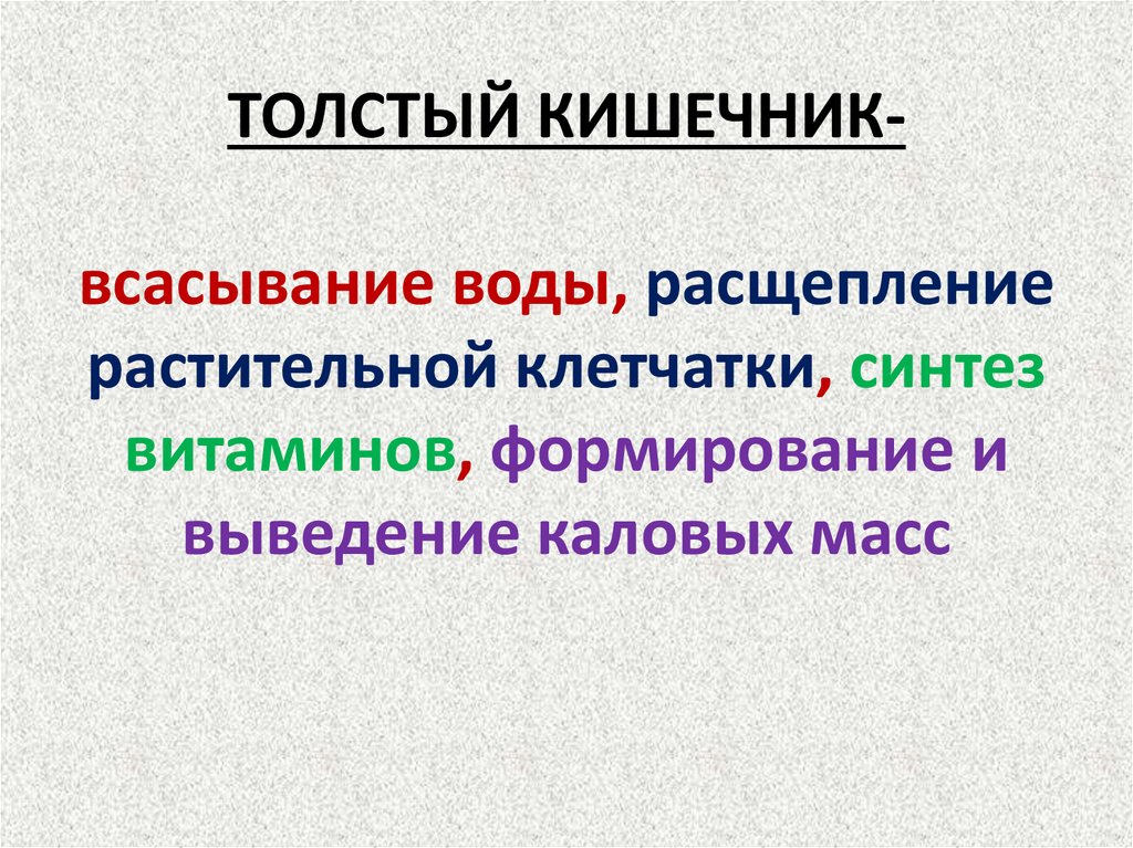 ТОЛСТЫЙ КИШЕЧНИКвсасывание воды, расщеплениерастительной клетчатки, синтез