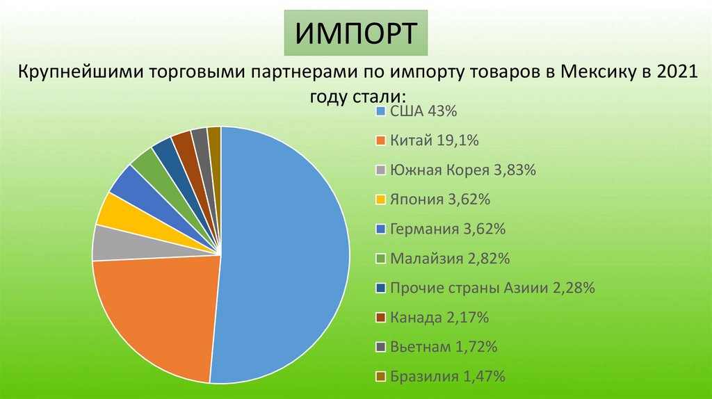 ИМПОРТКрупнейшими торговыми партнерами по импорту товаров в Мексику в 2021