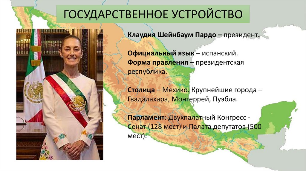 ГОСУДАРСТВЕННОЕ УСТРОЙСТВОКлаудия Шейнбаум Пардо – президент.