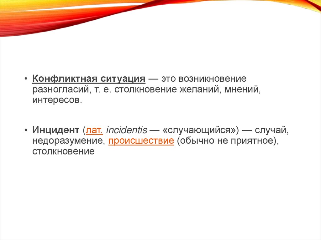 • Конфликтная ситуация — это возникновениеразногласий, т. е. столкновение желаний, мнений,