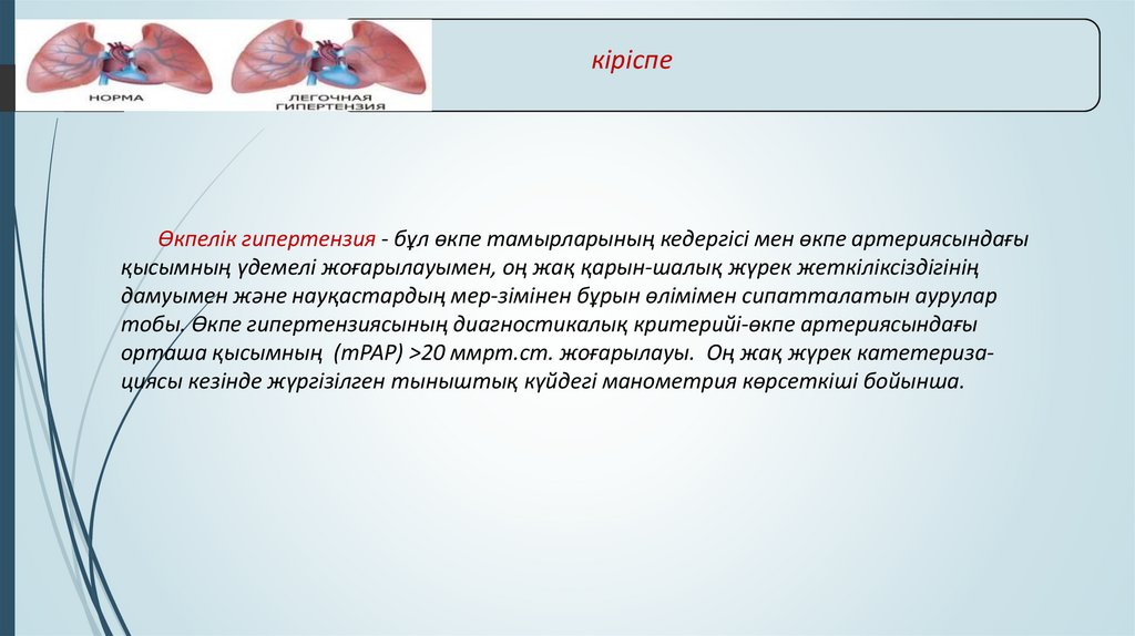 кіріспеӨкпелік гипертензия - бұл өкпе тамырларының кедергісі мен өкпе артериясындағы