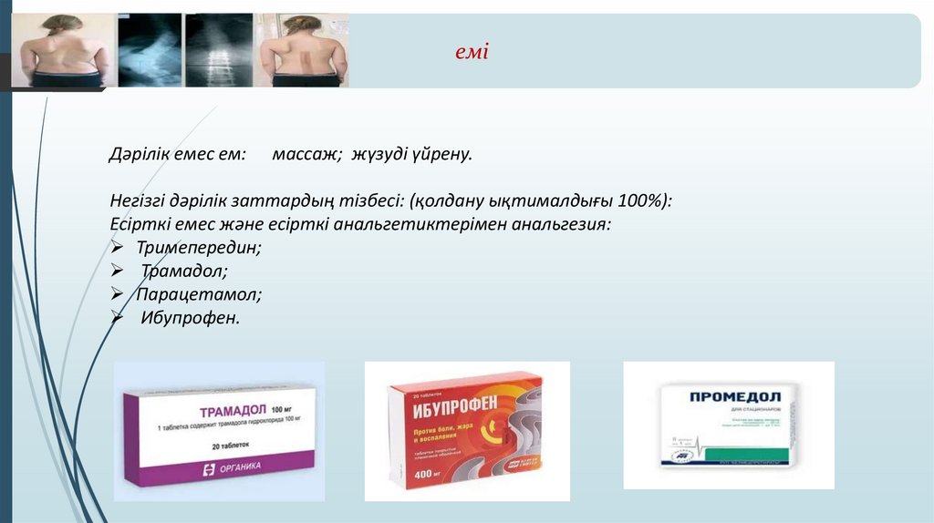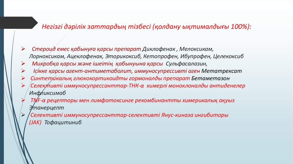 Негізгі дәрілік заттардың тізбесі (қолдану ықтималдығы 100%):Стероид емес қабынуға қарсы препарат Диклофенак , Мелоксикам,