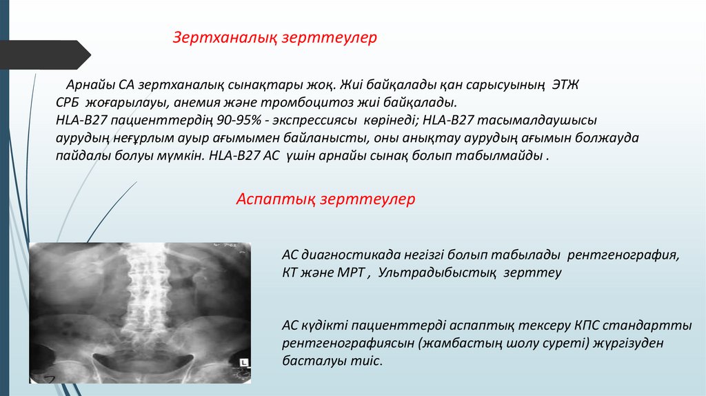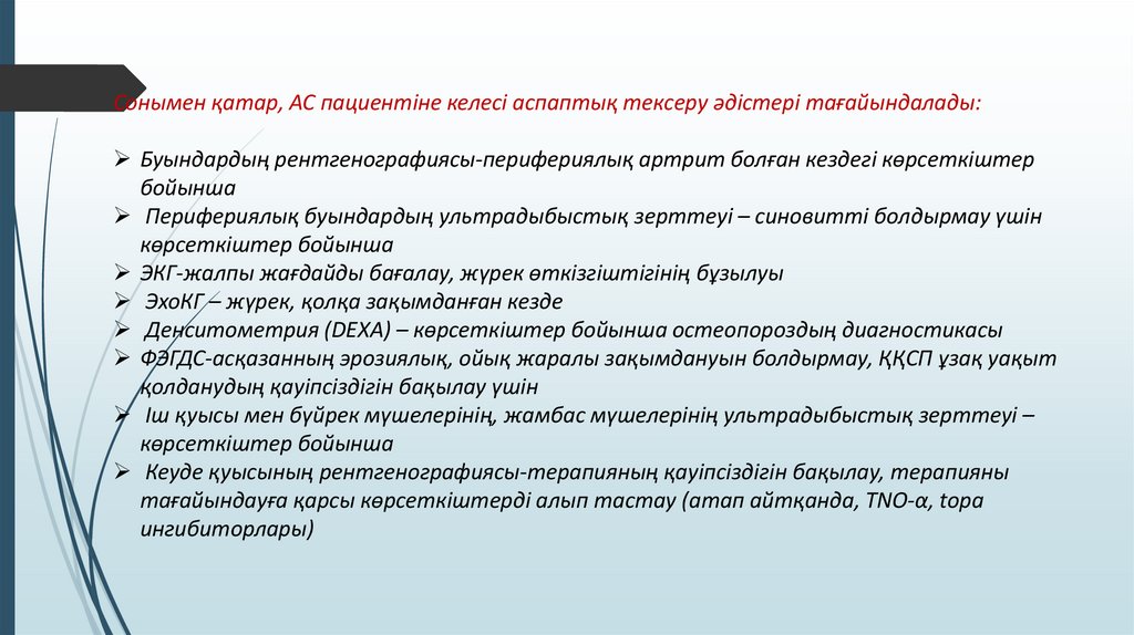 Сонымен қатар, АС пациентіне келесі аспаптық тексеру әдістері тағайындалады:Буындардың рентгенографиясы-перифериялық артрит болған кездегі көрсеткіштер