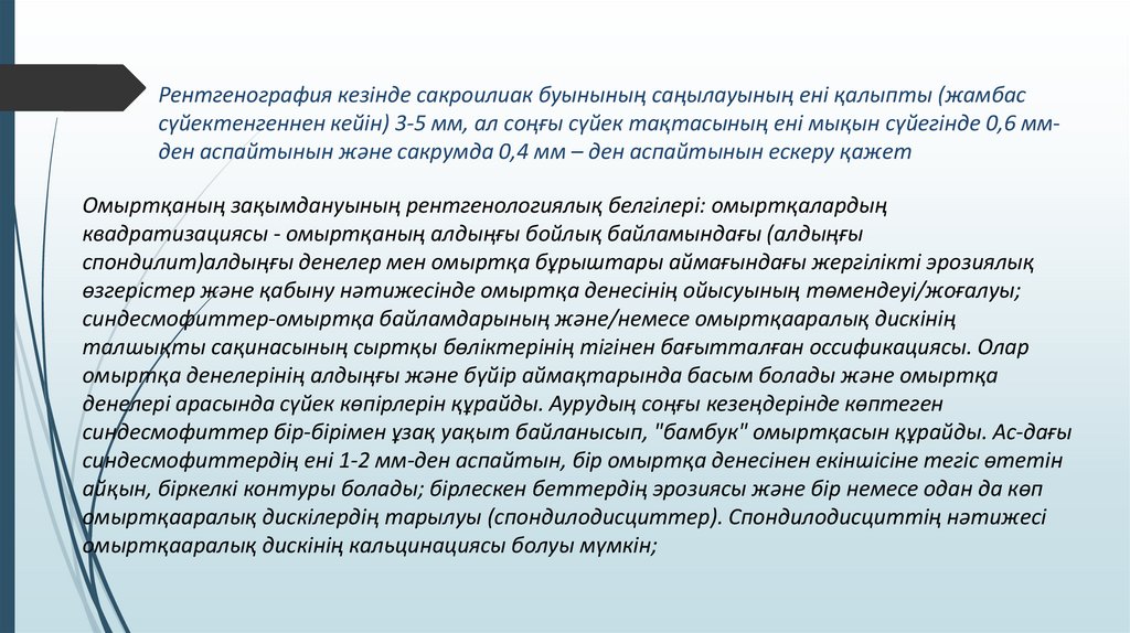Рентгенография кезінде сакроилиак буынының саңылауының ені қалыпты (жамбассүйектенгеннен кейін) 3-5 мм, ал соңғы сүйек тақтасының ені мықын сүйегінде 0,6 ммден аспайтынын және сакрумда 0,4 мм – ден аспайтынын ескеру қажет