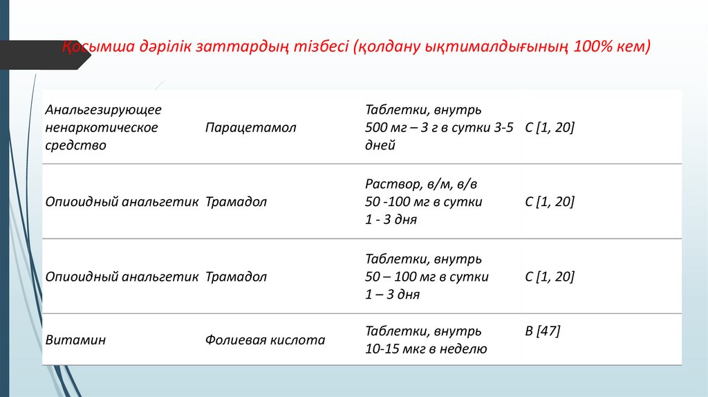 Қосымша дәрілік заттардың тізбесі (қолдану ықтималдығының 100% кем)Анальгезирующее
