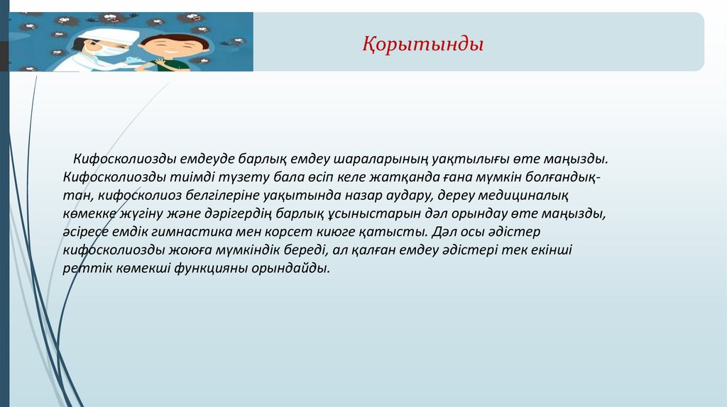 ҚорытындыКифосколиозды емдеуде барлық емдеу шараларының уақтылығы өте маңызды.