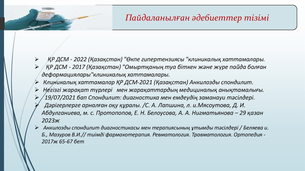 Б., Мазуров В.И.// тиімді фармакотерапия. Ревматология. Травматология. Ортопедия 2017ж 65-67 бет