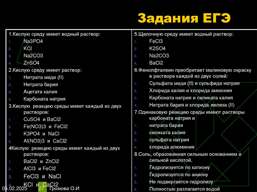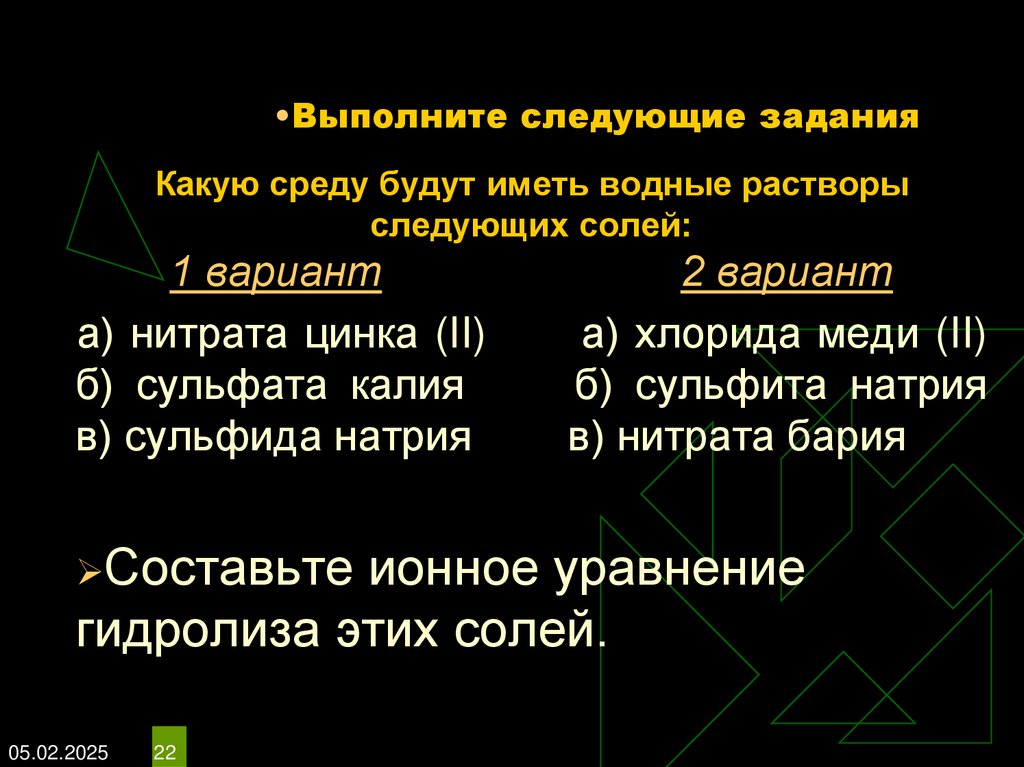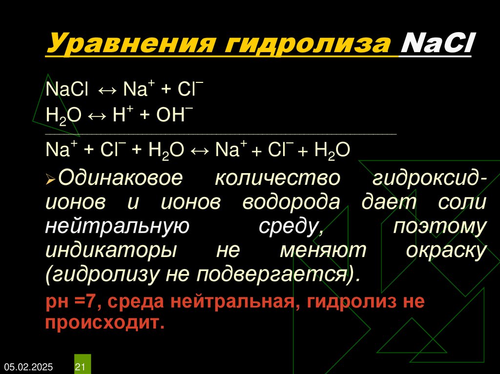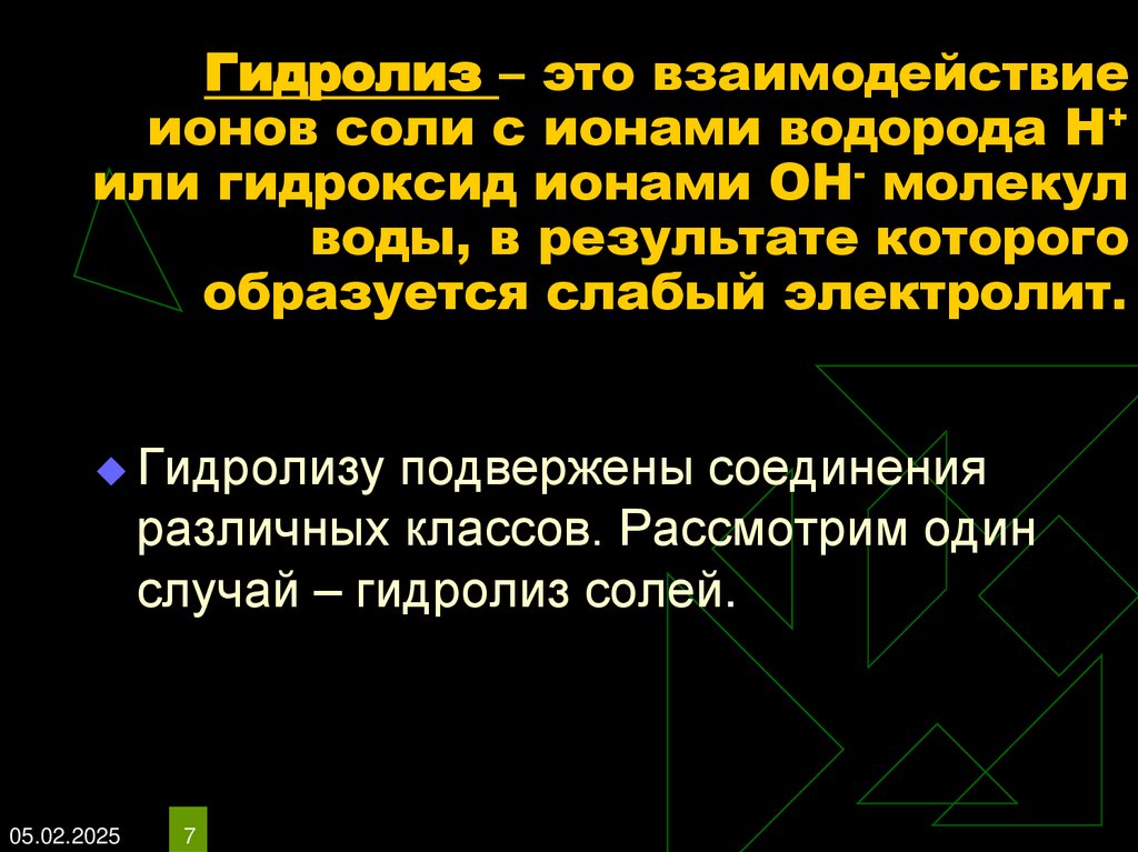 7. Гидролиз – это взаимодействие ионов соли с ионами водорода Н+ или гидроксид ионами ОН- молекул воды, в результате которого