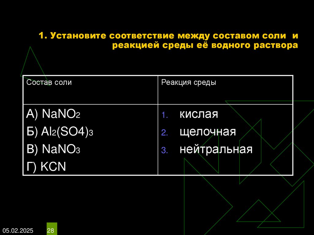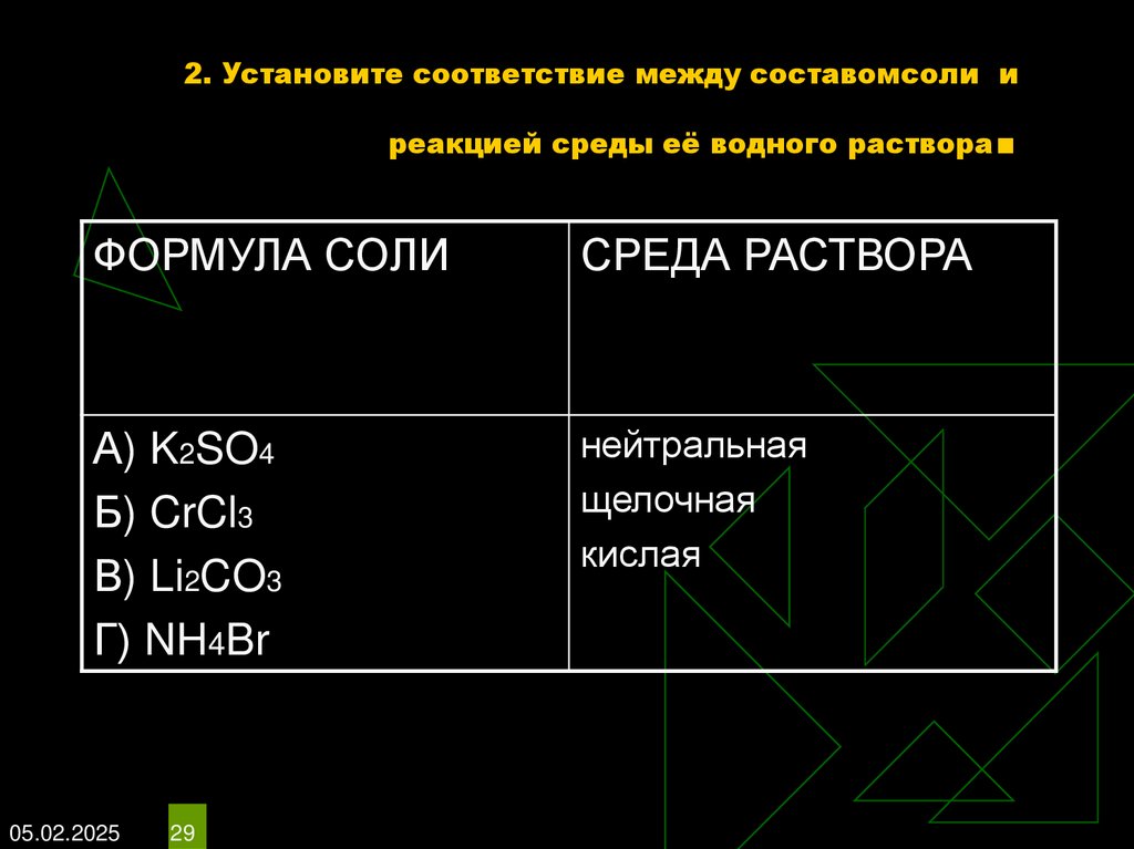 29. 2. Установите соответствие между составомсоли и реакцией среды её водного раствора.