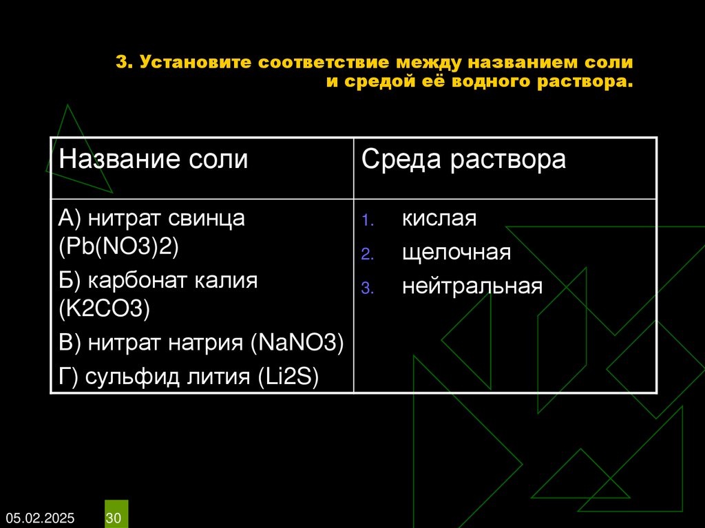 30. 3. Установите соответствие между названием соли и средой её водного раствора.