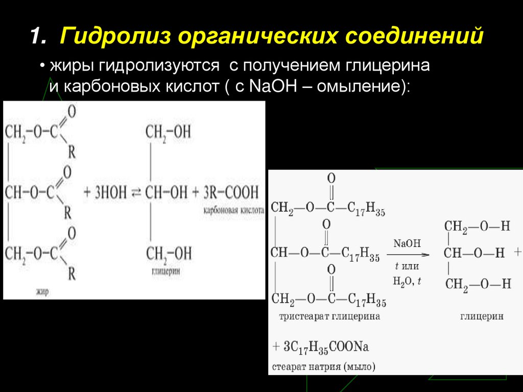 1. Гидролиз органических соединений• жиры гидролизуются с получением глицерина