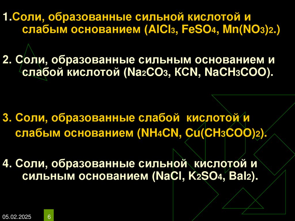 1.Соли, образованные сильной кислотой ислабым основанием (AlCl3, FeSO4, Mn(NO3)2.)