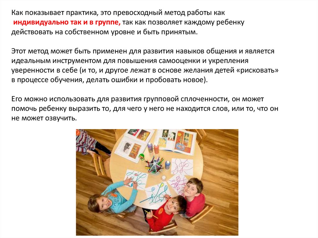 Как показывает практика, это превосходный метод работы какиндивидуально так и в группе, так как позволяет каждому ребенку