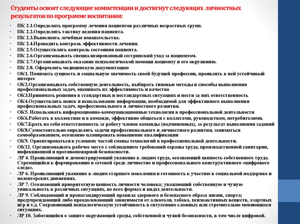 Студенты освоят следующие компетенции и достигнут следующих личностныхрезультатов по программе воспитания: