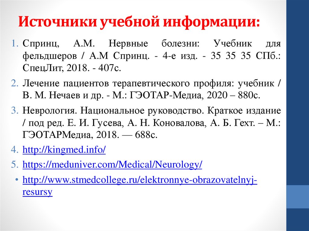 Источники учебной информации:1. Спринц, А.М. Нервные болезни: Учебник для