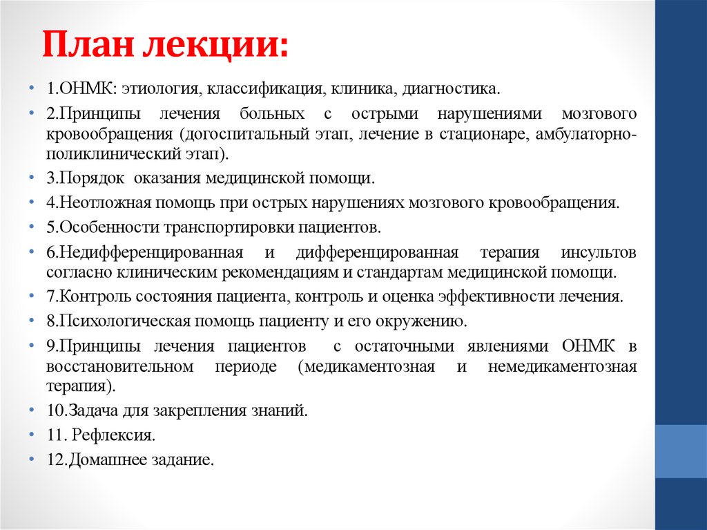 План лекции:• 1.ОНМК: этиология, классификация, клиника, диагностика.